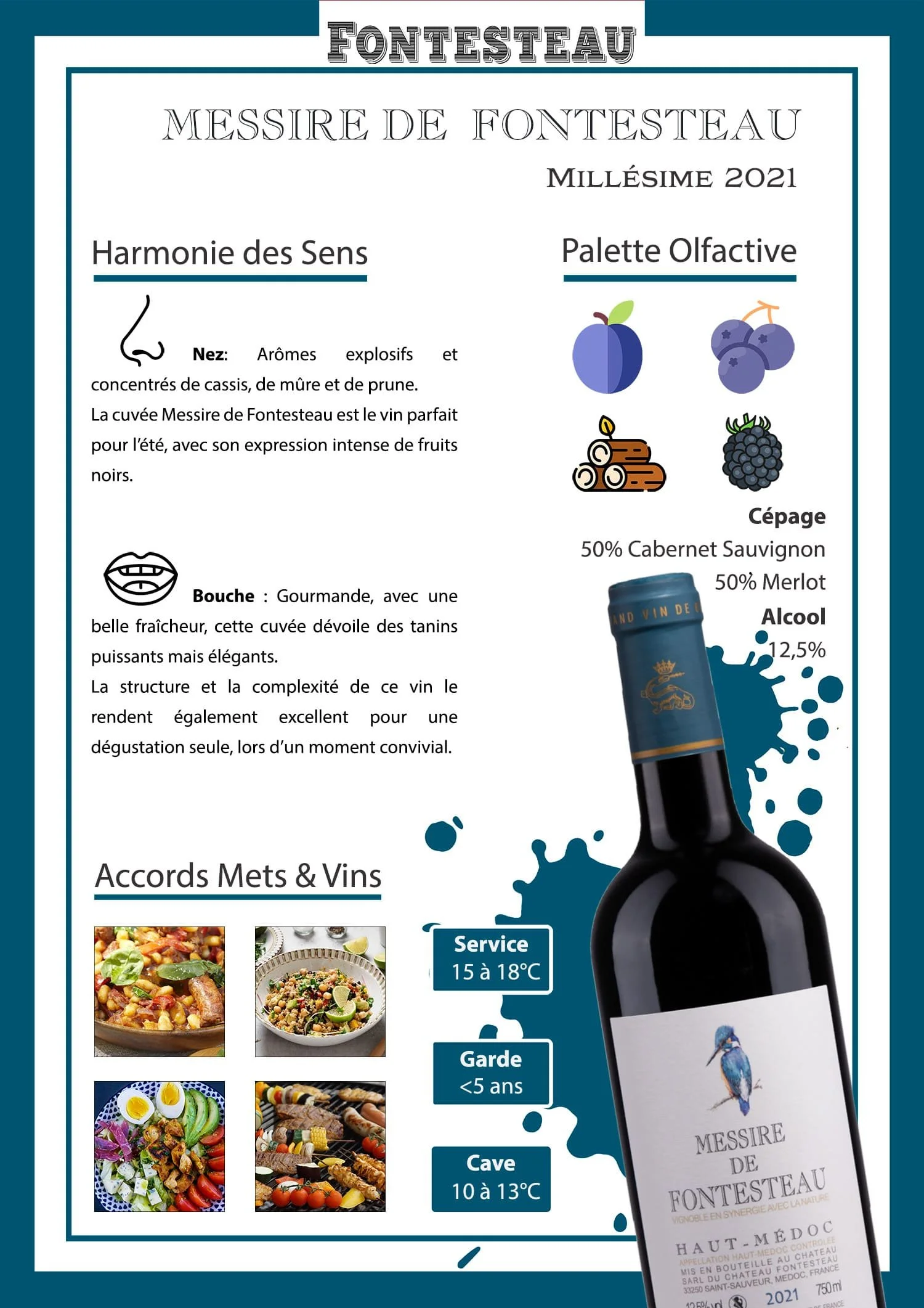 Affiche promotionnelle pour le vin "Messire de Fontesteau" millésime 2021. Elle décrit les arômes de cassis, mûre et prune, et précise la composition de 50% Cabernet Sauvignon et 50% Merlot, avec un taux d'alcool de 12,5%. Illustrations d'aliments en accord avec le vin sont présentes, ainsi que des recommandations de service et de garde.
