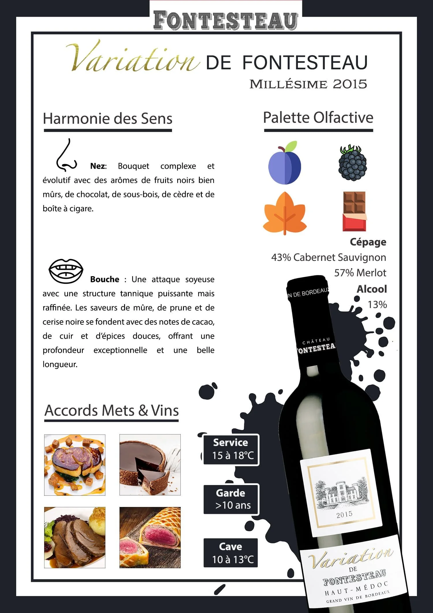 Affiche promotionnelle du vin "Variation de Fontesteau" millésime 2015. Elle inclut des notes de dégustation, indiquant des arômes de fruits noirs, chocolat, et cèdre. Il est composé de 43% Cabernet Sauvignon et 57% Merlot, avec un taux d'alcool de 13%. La fiche donne des recommandations d'accords mets et vins, et des conseils de service et de conservation.
